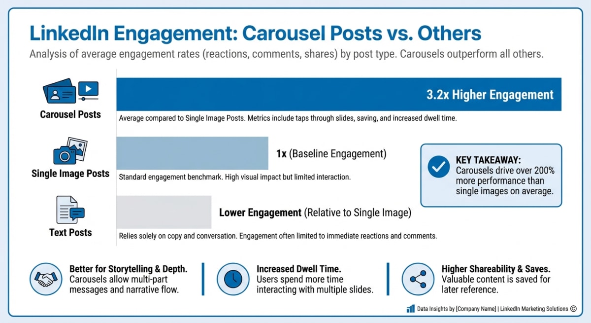 LinkedIn carousels get 3.2x more engagement than single-image posts. The swipeable format keeps people on your content longer, and the algorithm rewards that dwell time with more reach.