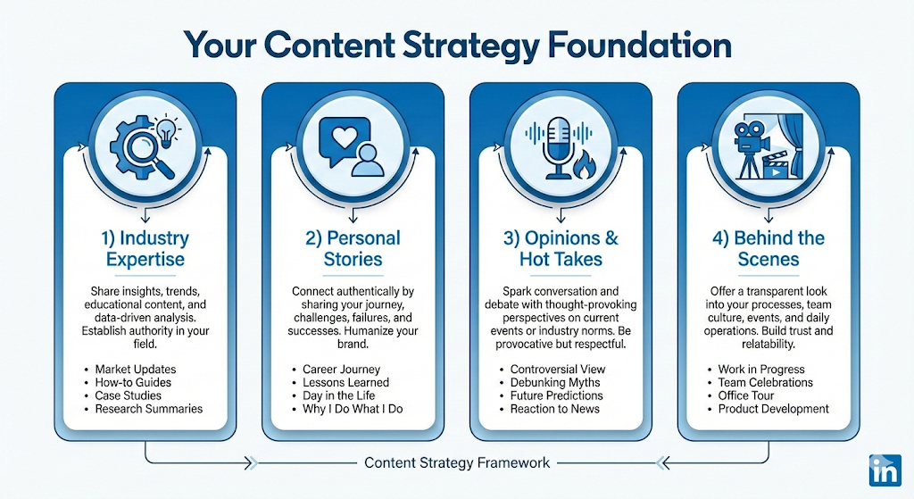 Every sustainable LinkedIn strategy rests on four content pillars. These are the core themes you'll return to repeatedly, signaling expertise to both your audience and the algorithm.