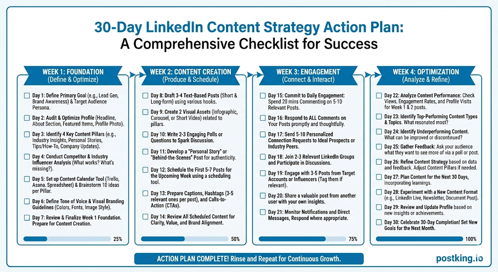 Pick one content pillar. Write one post. Publish it Tuesday at 8 AM in your audience's time zone. Spend 30 minutes after posting engaging with comments and other content in your feed.