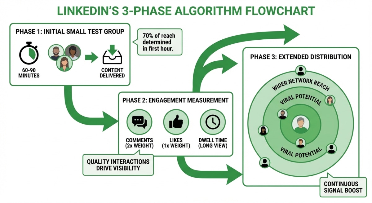 Based on your Phase 1 and 2 scores, LinkedIn decides whether to show your post to second and third-degree connections. High-performing posts keep spreading. Low-performing posts stop.
