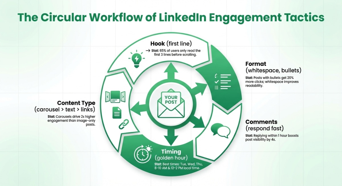 Learn proven strategies to boost LinkedIn engagement. Covers the algorithm changes, hook formulas, content formats, and the first-hour tactics that actually work.