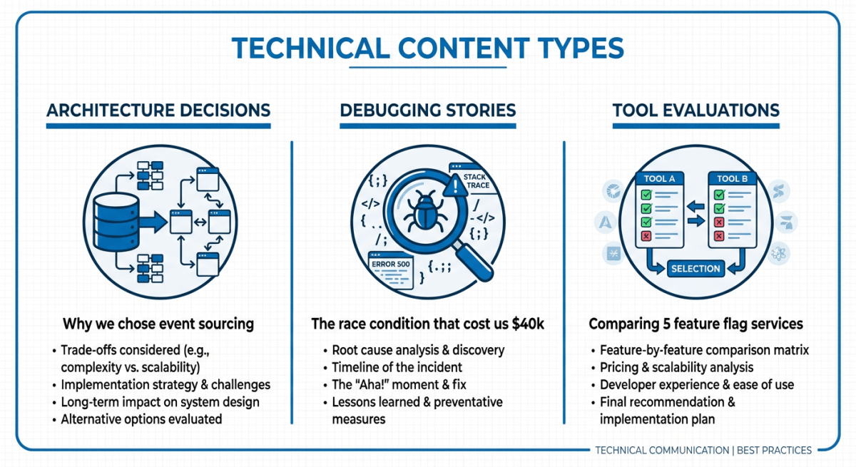 Instead of documenting for your team, you're documenting for your industry. Instead of explaining a decision to a coworker, you're explaining it to people who face similar decisions. The underlying skill is identical: taking complex technical work and making it understandable.