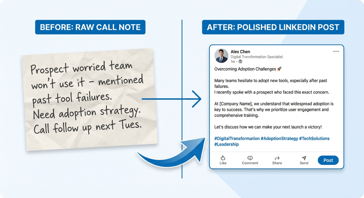 That single question became a post any B2B buyer can relate to. It positions the founder as thoughtful about adoption, not just features. And it provides genuine value to anyone evaluating software.